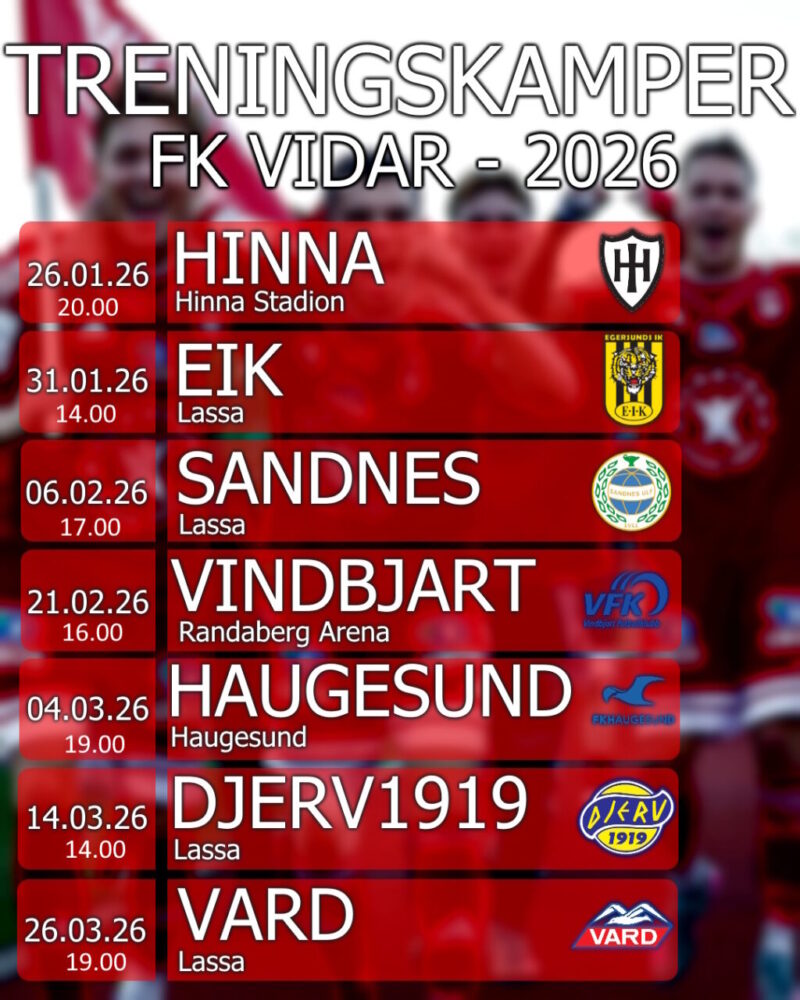 Det foregår en julekalender på FK Vidars facebook og instagram konto hvor vi presenterer spillerne og støtteapparatet som skal være med i troppen i 2026, både nye og gamle. Desember: Sander Remme Desember: Eivind Thomsen Desember: Frede Åsen Larsen (overgang fra Madla) Desember: Mathias Fister Andersen Desember: Lewi Brandser Desember: Marton Søyland Desember: Andreas Kirkevold…